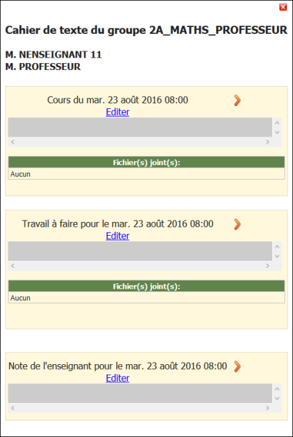 Cliquez sur Editer d'un item (cours, travail à faire,...) pour remplir ou modifier le cahier de textes.